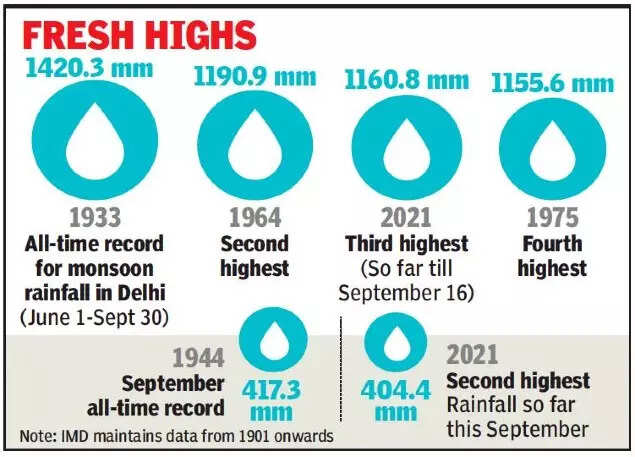 This is now the third-highest ever monsoon total recorded and the highest since 1964, according to India Meteorological (IMD) data, beating the 1975 record of 1,155.6mm of rainfall during the season. In the monsoon of 1964, Delhi had received 1,190.9mm. The all-time rainfall record for the season for Safdarjung is 1,420.3mm, which was witnessed in 1933.