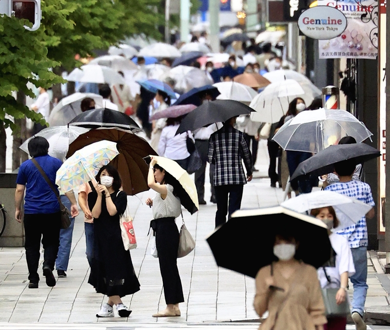 The Japan Meteorological Agency announced Thursday that the rainy season has started in regions including Kanto-Koshin, Hokuriku and southern Tohoku. Mask-wearing workers carrying umbrellas weaved their way through an office district in central Tokyo after rain began falling at about 1:50 p.m.