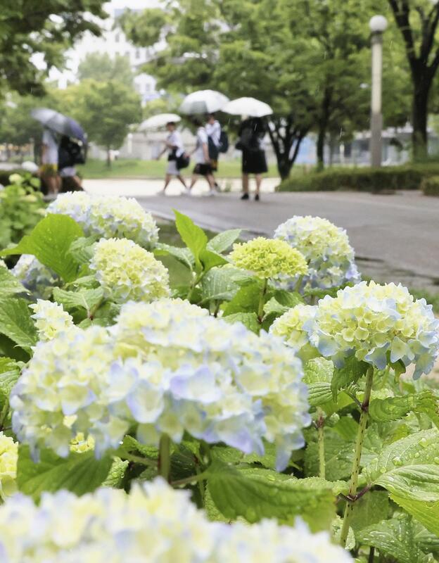 On Sunday, umbrella-toting parkgoers undeterred by the drizzle could be seen at Ogimachi Park in Kita Ward, Osaka City, taking photos of the dew-specked hydrangea blossoms of the season.
