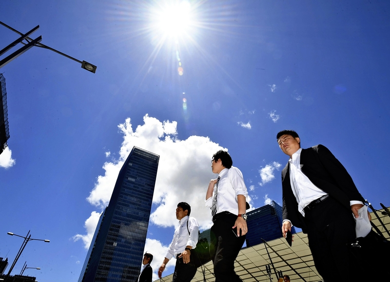 People walk under the sun in Shinjuku Ward, Tokyo, on Friday, as the Japan Meteorological Agency announced the end of the rainy season in the Kanto-Koshin region, one week earlier than last year and 22 days earlier than average. It is the first time this announcment for the Kanto-Koshin region, which includes Tokyo, has been given in June, according to the agency, making it the earliest announcement since recordkeeping began in 1951.