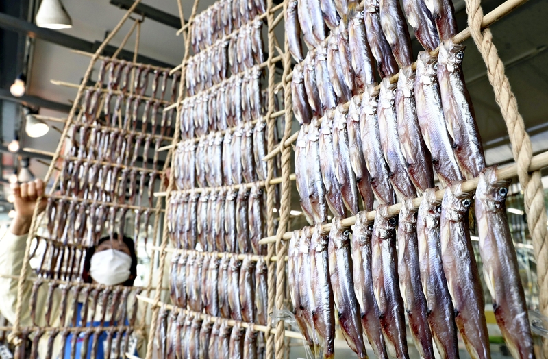 Specialty shops salt the fish with seawater, skewer them in batches of 10 and hang them to dry from the store's front eaves. The sparkling silver hues of the flesh catch shoppers' eyes.