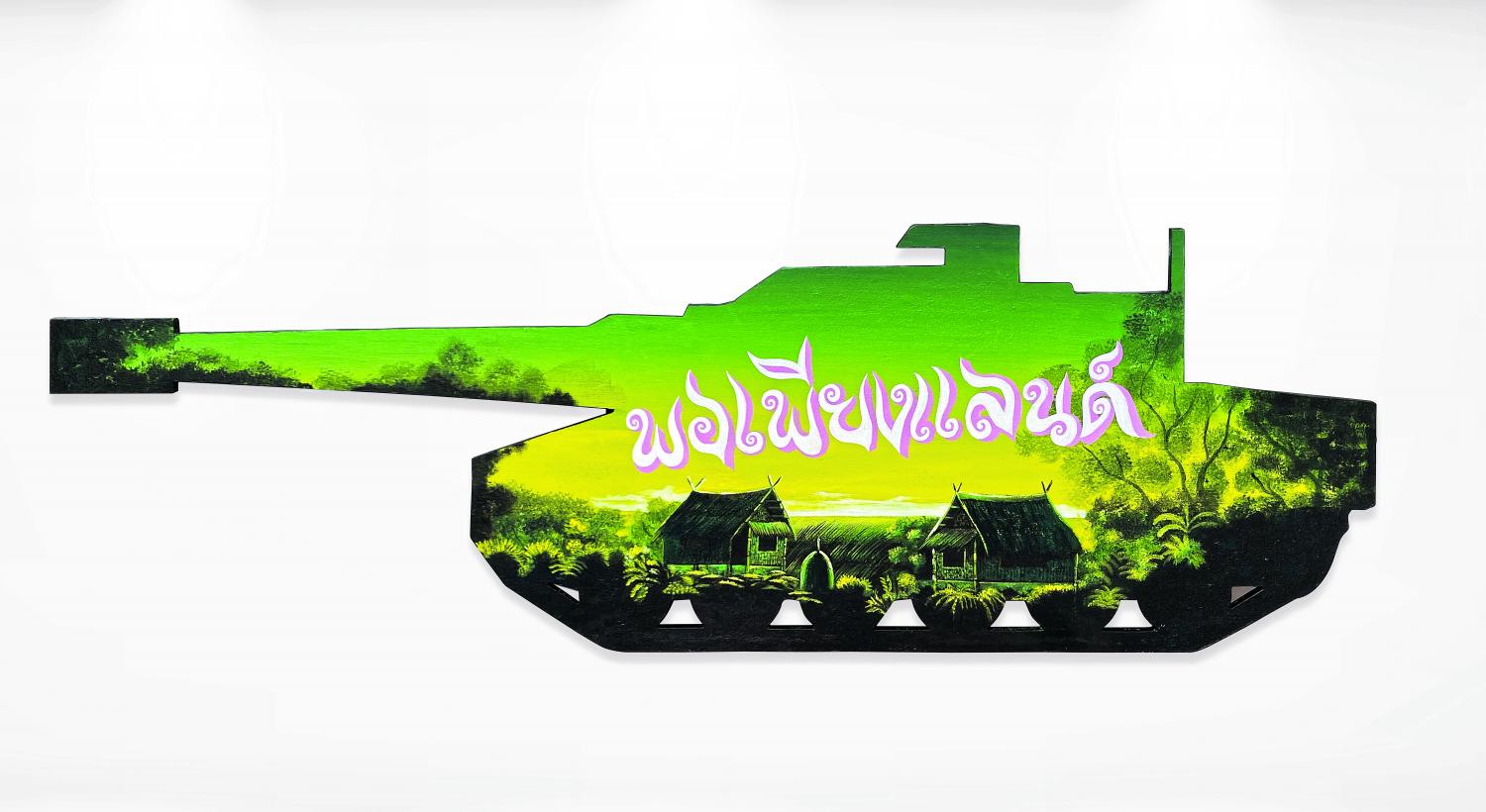 To get his message across, Prakit simulates the viewers' senses by using advertising billboards, curving the wooden boards into shapes of military vehicles, which feature paintings of yesteryear's rural ambience for good measure. He also adds information in his paintings to direct the viewer to the message he hopes to convey.
