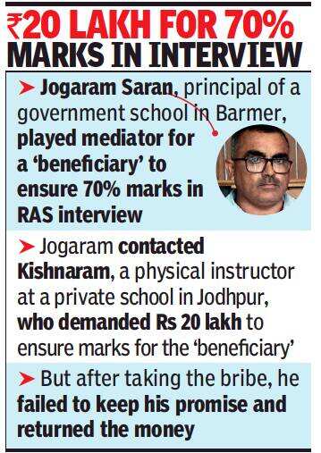 JODHPUR/JAISALMER: The anti-corruption bureau (ACB) on Thursday arrested three persons, including the principal of a government school, in a bribery case related to Rajasthan Administrative Service (RAS) examination. The agency also seized the bribe amount of Rs 20 lakh which was returned by the mediator after he failed to keep his promise of ensuring 70% marks to the ‘beneficiary’ in the RAS interview.