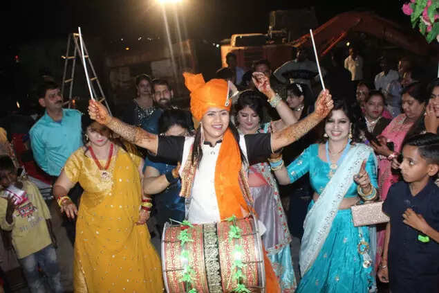 KOTA: A 26-year-old science graduate interior designer bride drove a decorated tractor for over a kilometre to reach her Mahila Sangeet venue on Jhalawar Road in Kota on Tuesday. Wearing a silk dhoti, half-sleeved kurta, a jacket along with a saffron turban, she made a grand entry beating the drums, leaving her parents and guests emotional.