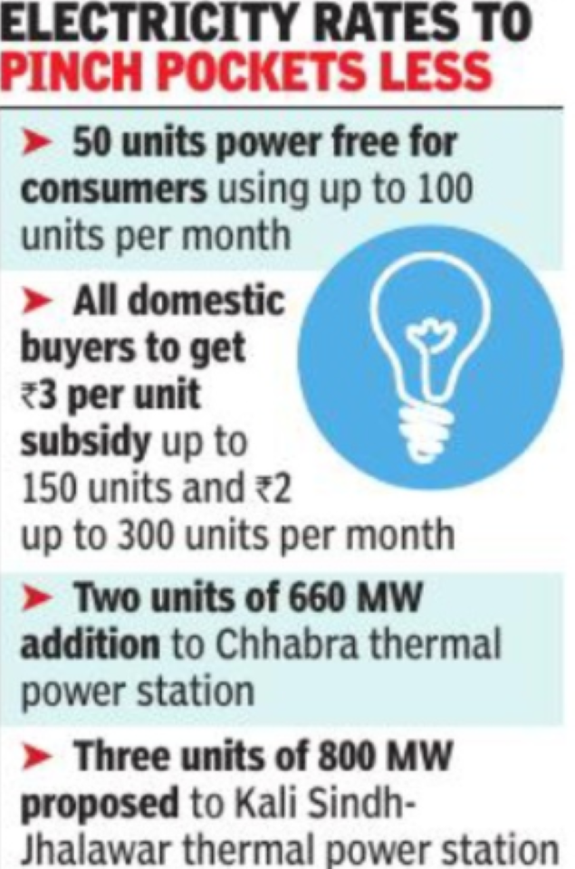 JAIPUR: The state budget had announced some relief to power consumers. Households consuming up to 100 units per month will get 50 units free while all domestic consumers will get Rs 3 per unit subsidy up to 150 units and Rs 2 up to 300 units of power per month.