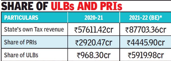 As per the provisional data of 2020-21 and budget estimates for 2021-22, government’s own tax revenue is pegged at Rs 57611. 42 crore and Rs 87703.36 crore respectively. At 6.75% devolution of the taxes, PRIs and ULBs will get Rs 3,888.77 crore in 2020-21 and Rs 5919.98 crore in 2021-22.