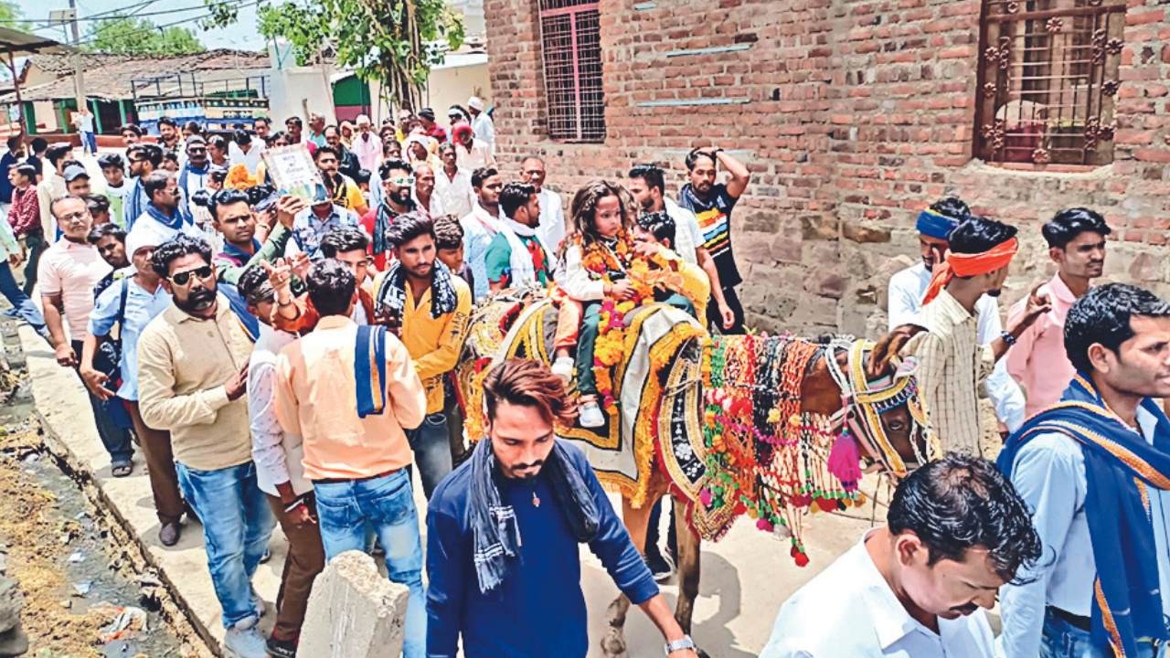 KOTA: It was a moment of pride and dignity for the people of Harijan community in Chajwa village in Atru tehsil of Baran on Sunday when a 5-year-old boy of the community, on the occasion of his tonsure ceremony, rode on a mare in a procession carried out through the narrow lanes of the village amid a shower of flower petals and garlands.