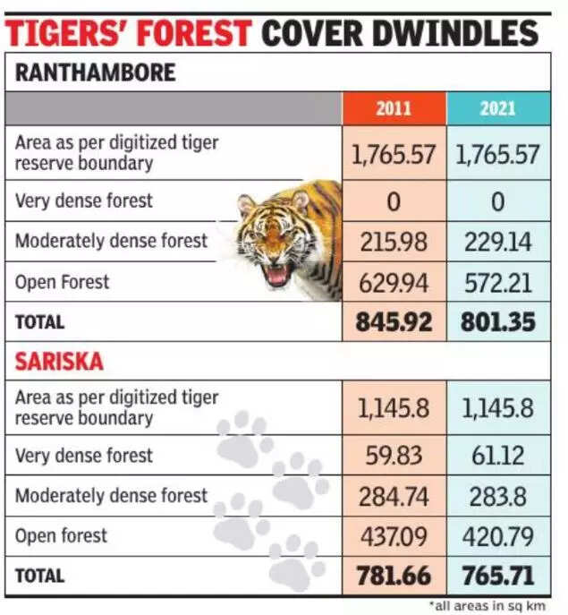 JAIPUR: Two popular tiger habitats in the state, Ranthambore and Sariska, have registered a decrease in forest cover over a decade, according to the latest report of the Forest Survey of India (FSI).