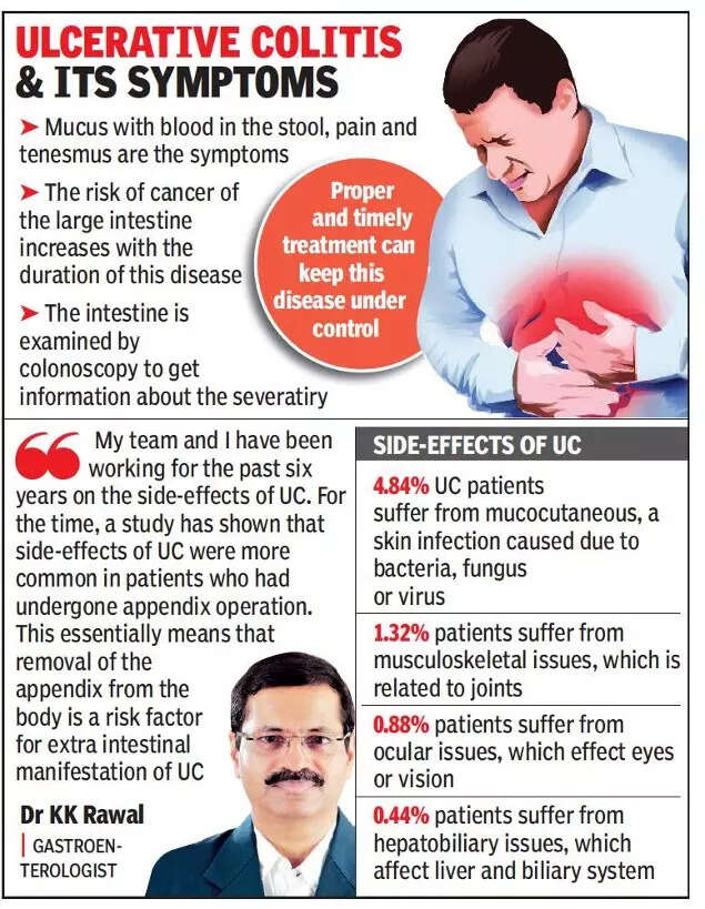 The study, which involved closely observing 227 patients of ulcerative colities (UC), was done by Rajkot-based gastroenterologist Dr KK Rawal. The study published in the reputed Indian Journal of Gastroenterology was aimed at finding out the side-effects of UC and the subsequent surgeries, mainly that of appendix, carried out in some patients.