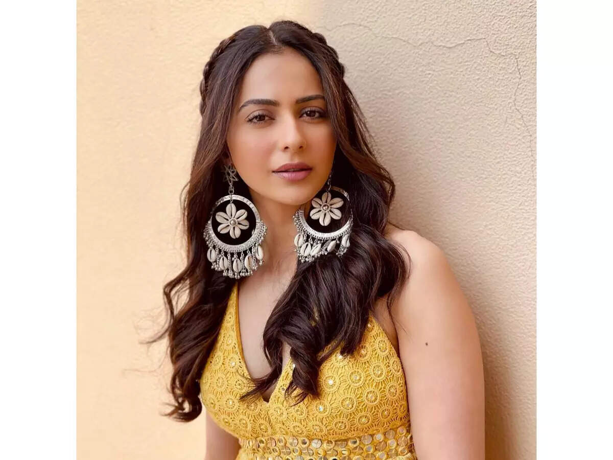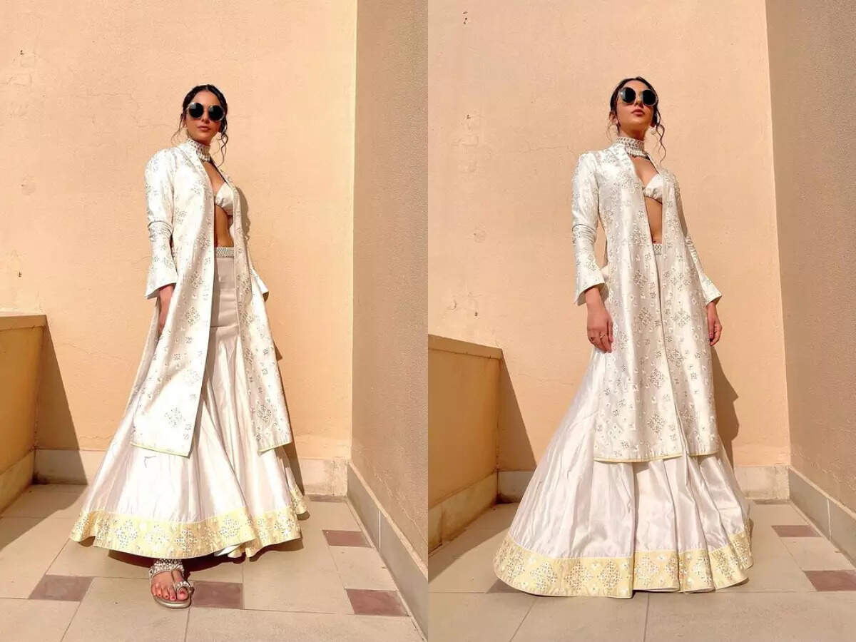 She paired this white bralette with a matching skirt and a jacket from Sukriti and Aakriti. Rakul rounded off her look with a pair of circular sunnies.