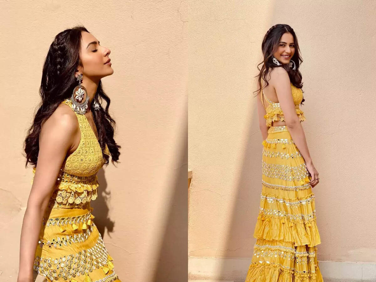 Rakul looked ethereal in a yellow tiered chanderi ghagra, embellished with shells, mirrors, coins and tassels. She paired it with a crochet choli with cross back, finished with small crushed ruffles.