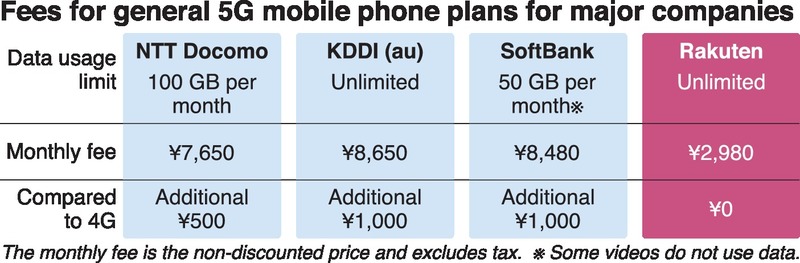 Rakuten Inc. launched an unlimited data plan for its 5G mobile phone service on Wednesday that costs less than half the price of three major companies, including NTT Docomo, Inc. Rakuten's 5G -- the next-generation wireless network technology -- unlimited data plan costs 2,980 yen per month, excluding tax. This may increase the pressure on the three major companies, which have already entered the 5G market.