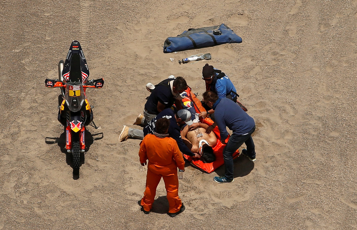 (Reuters) - Sam Sunderland's Dakar Rally title defence ended on Tuesday after the British motorcycle rider crashed in Peru's Ica desert while leading the race and had to be flown out by helicopter.