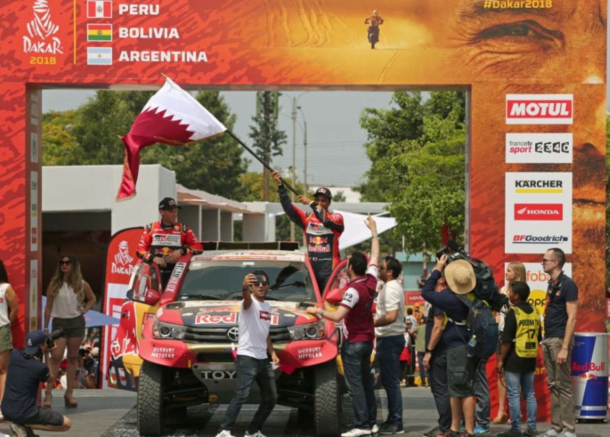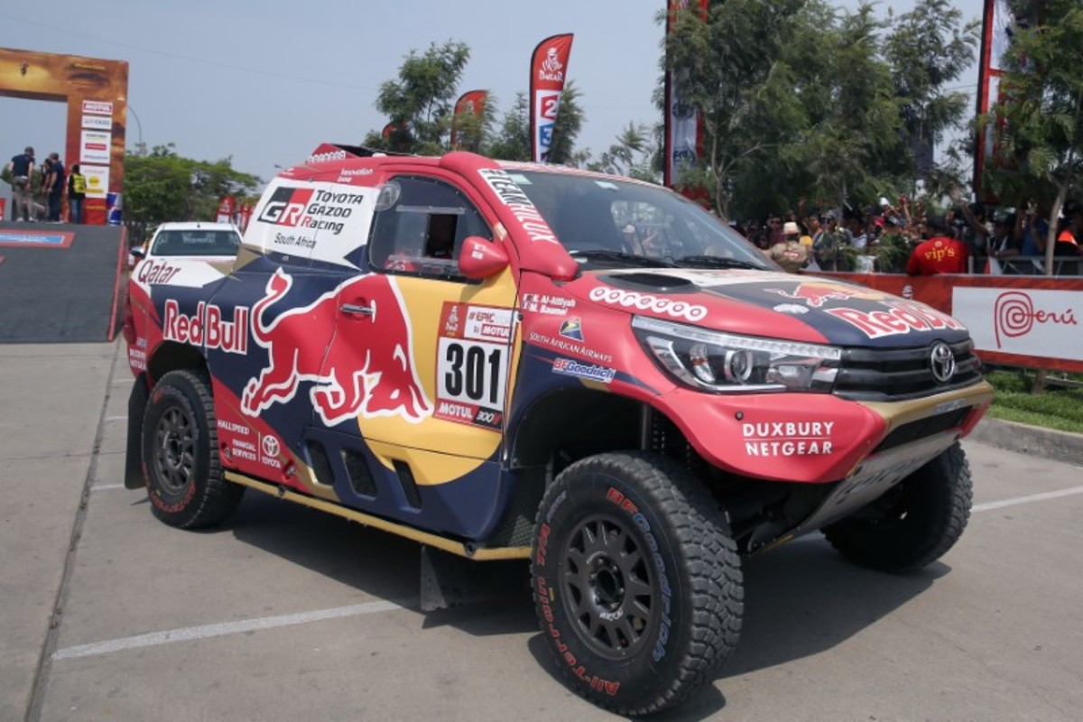 Dakar Rally - 2018 Peru-Bolivia-Argentina Dakar rally - 40th Dakar Edition - January 6, 2018 - Toyota Gazoo Racing SA team driver Nasser Al-Attiyah of Qatar (R) and co-driver Matthieu Baumel of France wave on the podium during the departure ceremony in Lima, Peru. REUTERS/Mariana BazoDakar Rally - 2018 Peru-Bolivia-Argentina Dakar rally - 40th Dakar Edition - January 6, 2018 - Toyota Gazoo Racing SA team driver Nasser Al-Attiyah of Qatar crosses the podium during the departure ceremony in Lima, PeruREUTERS/Guadalupe PardoDakar Rally - 2018 Peru-Bolivia-Argentina Dakar rally - 40th Dakar Edition First stage from Lima to Pisco, Peru - January 6, 2018 - Toyota Gazoo Racing SA team driver Nasser Al-Attiyah and copilot Mathieu Baumel. REUTERS/Andres Stapff