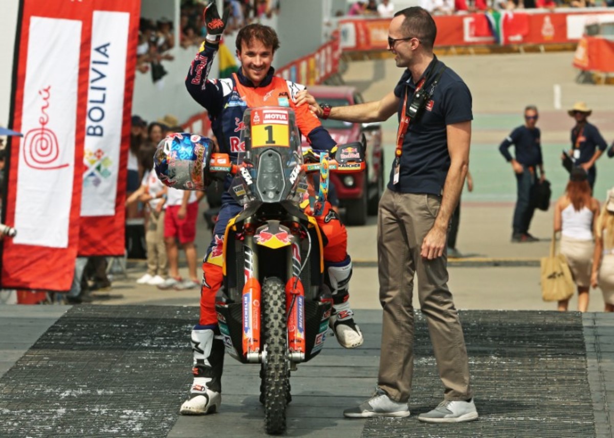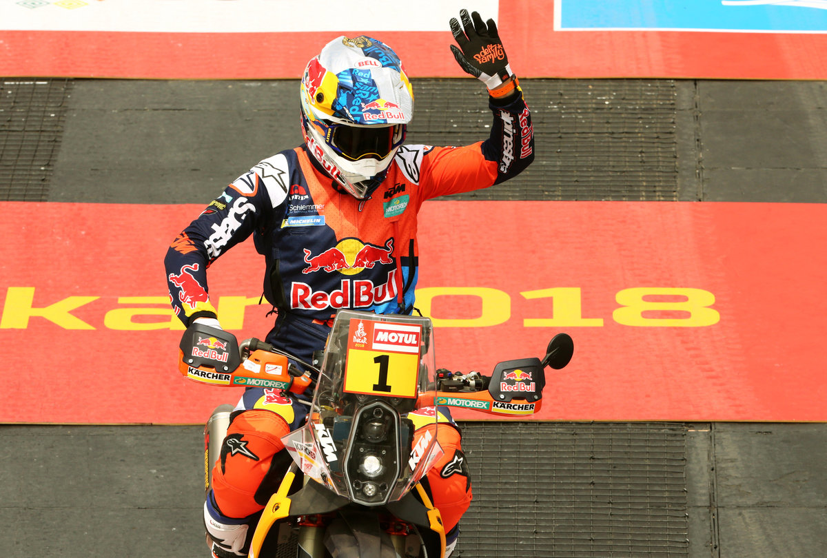 Dakar Rally - 2018 Peru-Bolivia-Argentina Dakar rally - 40th Dakar Edition - January 6, 2018 - Red bull KTM factory team rider Sam Sunderland of Britain waves on the podium during the departure ceremony in Lima, Peru. REUTERS/Mariana Bazo