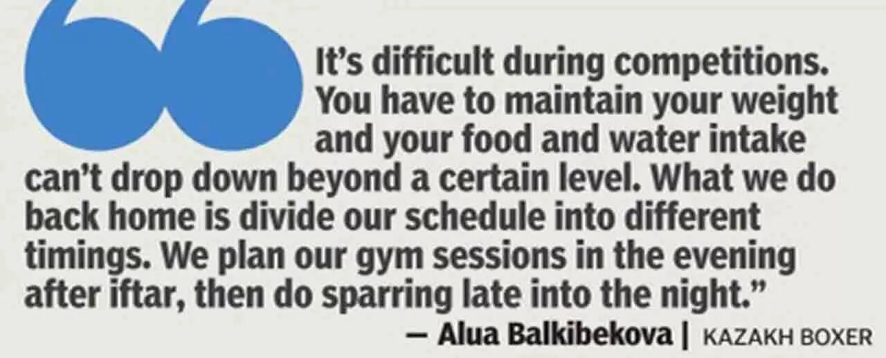 "It's difficult during competitions. You have to maintain your weight and your food and water intake can't drop down beyond a certain level. What we do back home is divide our schedule into different timings. We plan our gym sessions in the evening after iftar, then do sparring late into the night and end our training with some cardio and cool-down exercises before assembling for suhur (last meal eaten before fasting from dawn to sunset). We go to sleep thereafter and take complete rest during the day before repeating the same process again," Balkibekova said.