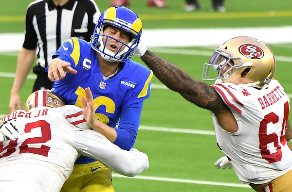 Against the 49ers, Goff lost a fumble and had two passes intercepted, one that was returned for a touchdown.