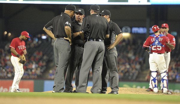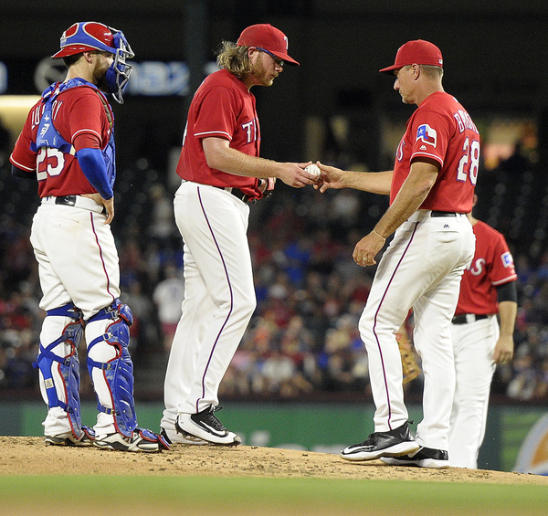Both benches were warned during the seventh inning after Rangers pitcher Keone Kela's pitch sailed over Andrelton Simmons' head. In the eighth, Angels' reliever Brett Oberholtzer was ejected after he hit Elvis Andrus. Oberholtzer protested that he wasn't throwing at Andrus. Earlier, Angels' starter Daniel Wright hit Adrian Beltre and Jonathan Lucroy in the fifth inning.