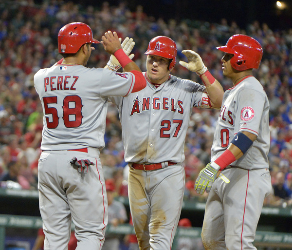 Holland was charged with five runs (four earned) on six hits and a two walks in five innings. The big blast was a three-run homer in the fifth by Mike Trout that gave the Angels a 5-1 lead. Jose Leclerc started the sixth but left after a leadoff double and a walk with one out. Tanner Scheppers came in and walked Carlos Perez to load the bases before striking out pinch-hitter Cliff Pennington and getting Yunel Escobar to ground out. Scheppers walked one and struck out one in 21/3 scoreless innings. Alex Claudio replaced Scheppers to face Rafael Ortego and got a groundout to end the inning. Matt Bush pitched a scoreless ninth.