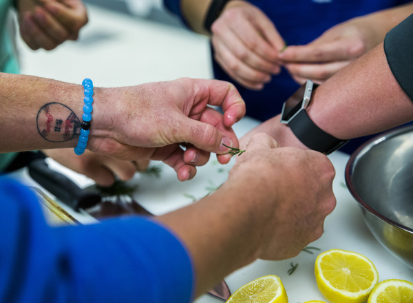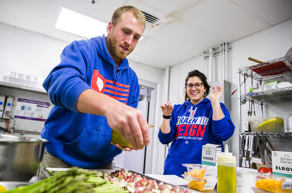 And she will hand out recipes for the dinner they are about to cook: Simple garlic chicken with rosemary roasted potatoes and asparagus (because the players kind of flinched at brussels sprouts). They will also make a healthier version of macaroni and cheese, using Greek yogurt instead of heavy cream.