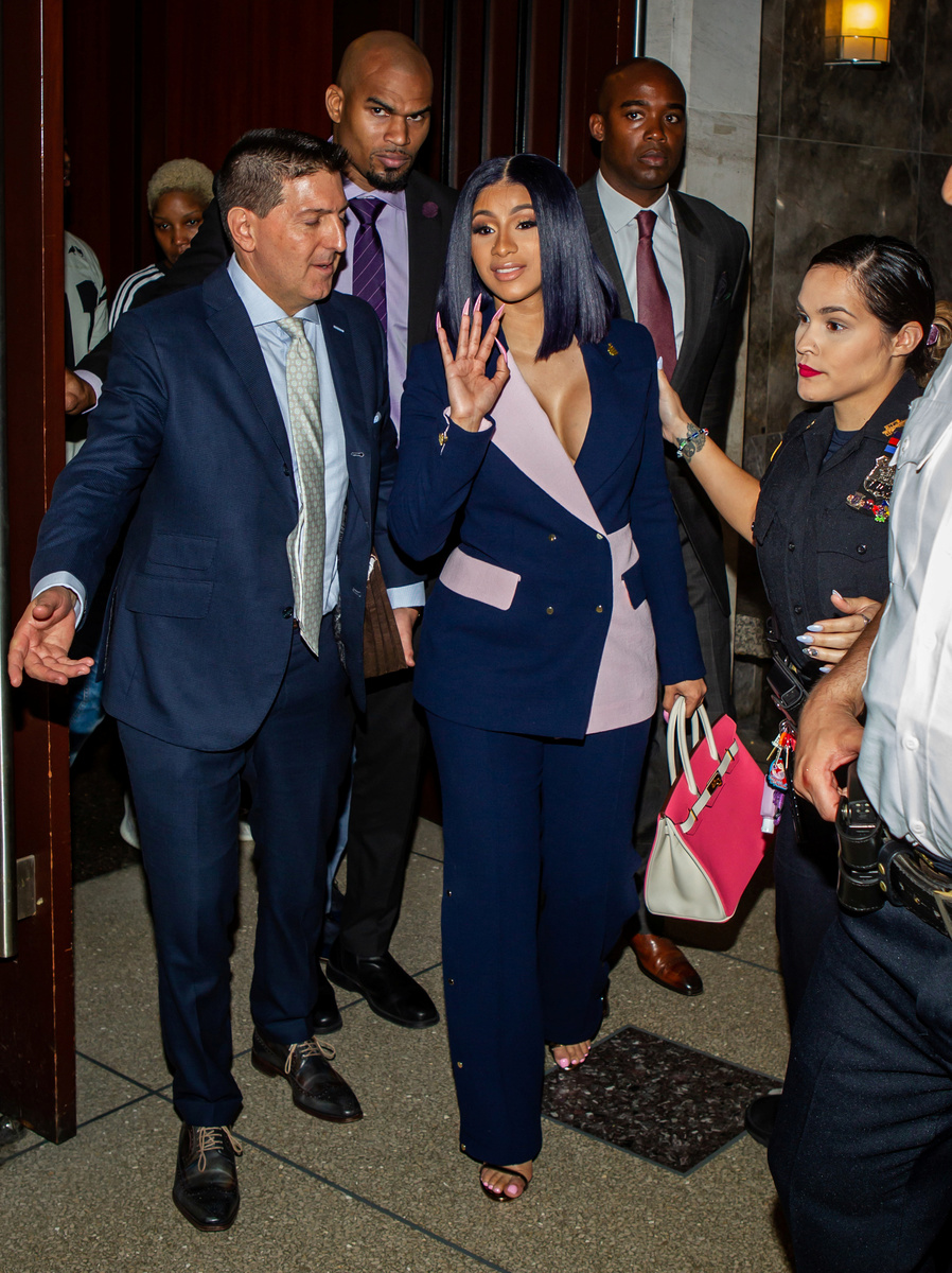The singer, known for chart-topping hits "Bodak Yellow" and "I like it," waved back with a hand sporting long, pink fingernails, before being ushered into the court by her lawyer and two bodyguards.