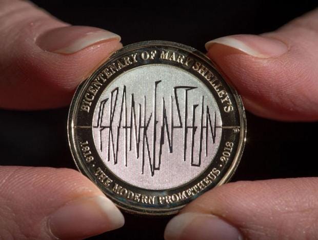 The £2 coin celebrating Shelley’s Gothic classic will feature the word Frankenstein in the centre and the book’s full title, “the Modern Prometheus”, in the outer gold ring.
