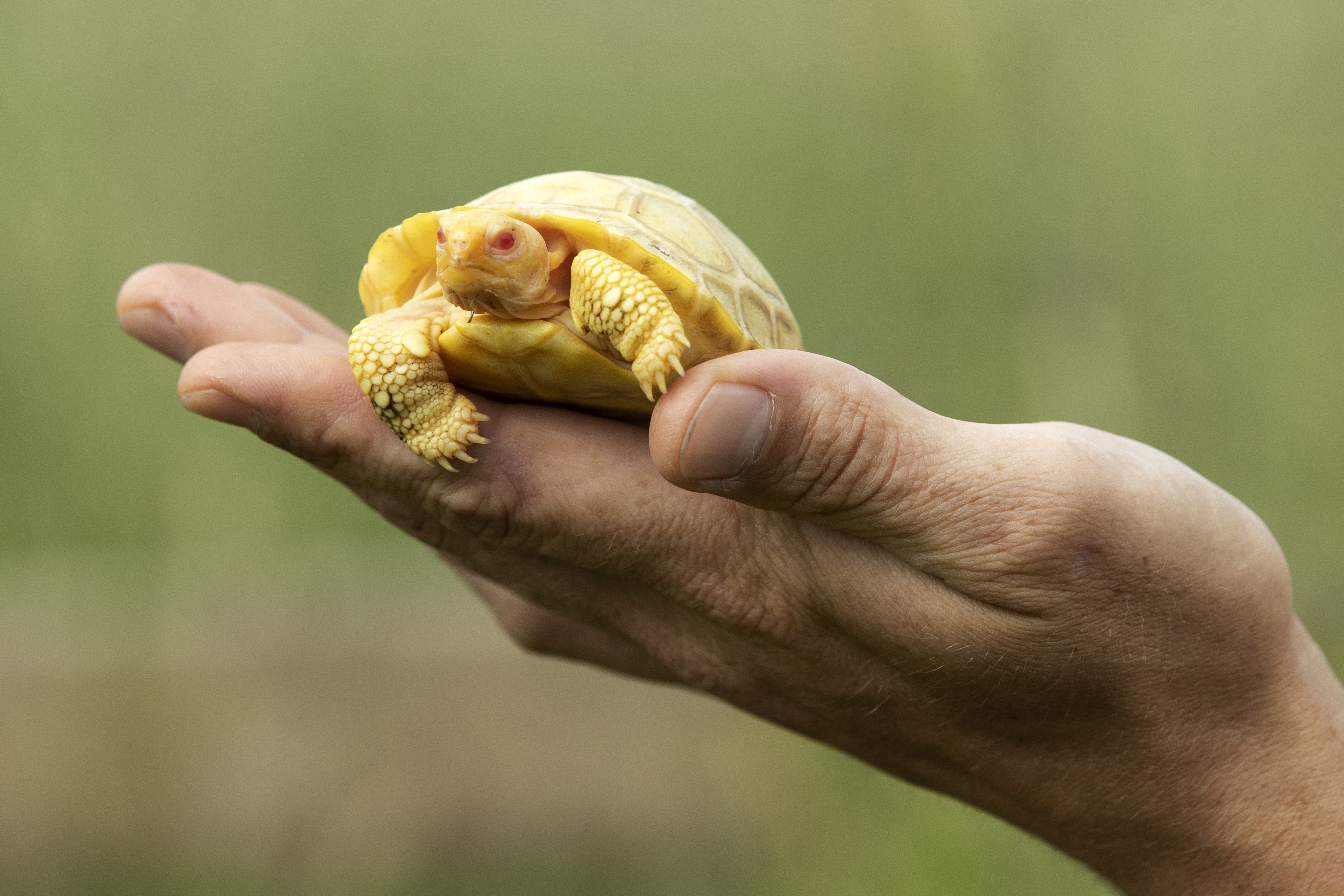The mother, who weighs more than 100 kilograms, laid five eggs on February 11 and the albino baby hatched on May 1.
