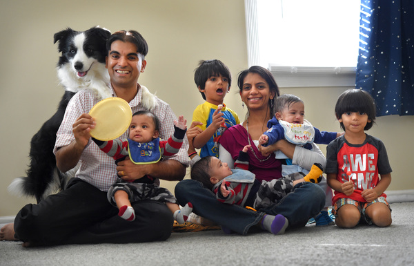 In their Clarksville home, where they are helped by a nanny, the Saggars seem to manage the care of their five children with ease. They have transformed the den into a playroom. The older boys work on computer tablets near the babies . One of the babies bobs in a baby bouncer, another lies on a blanket, and Mom holds the third. The family dog runs around with a Frisbee in its mouth, looking for someone to play with.