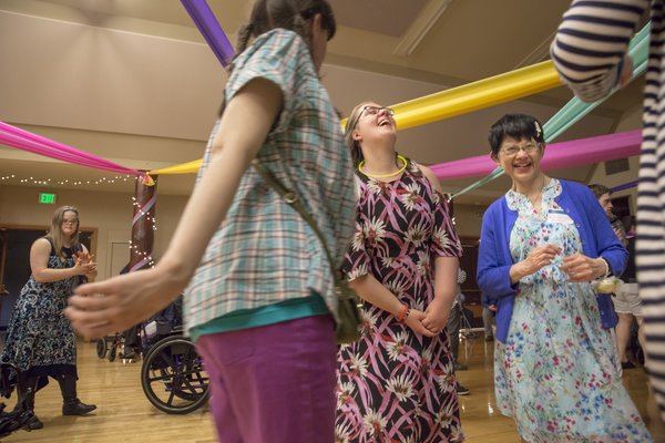 The Highland Community Center in Bothell was decked out with streamers, laser lights and a pizza dinner. Hundreds of program participants and peer buddies danced together and did the crowd favorites like the Electric Slide, Cupid Shuffle, and a conga line. Kelley sung her favorite songs at top volume and twirled friends on the dance floor, continually urging Leslie to join her.