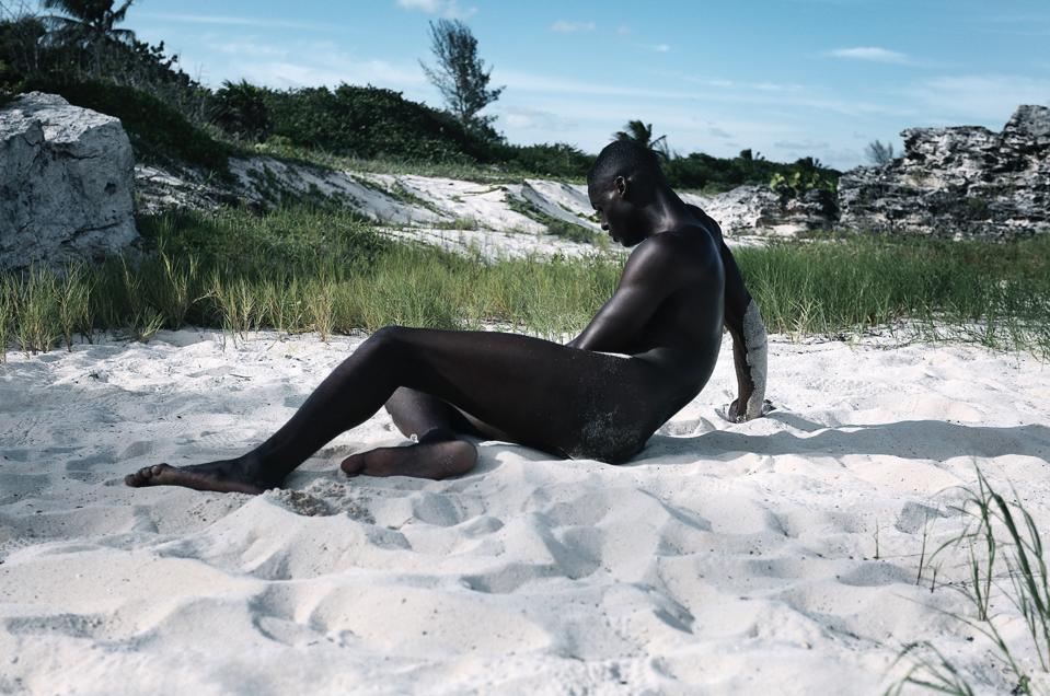 This lens on the male nude is a political one for Scruggs. “This is a patriarchal society that has been dominated by men having the power to desenstize the public to the female nude while intentionally making the public highly sensitive to viewing male genitalia” she tells me, when I ask about her image Roze en la Playa, which sees the chef and model Roze Traore laying in a pose reminiscent of Ingre’s Grande Odalisque painting on a sandy beach. Scruggs cleverly highlights the knock-on effect of a visual culture permeated with passive female nudes, but far fewer of men.