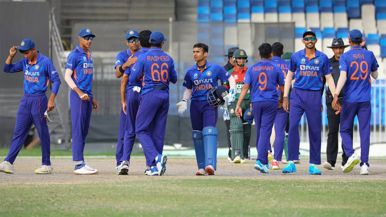 For India, Ravi Kumar (2/22), Vicky Ostwal (2/25), Raj Bawa (2/26) and Rajvardhan Hangargekar (2/36) shared eight wickets between them, while Kaushal Tambe (1/5) and Nishant Sindhu (1/25) picked up a wicket each.