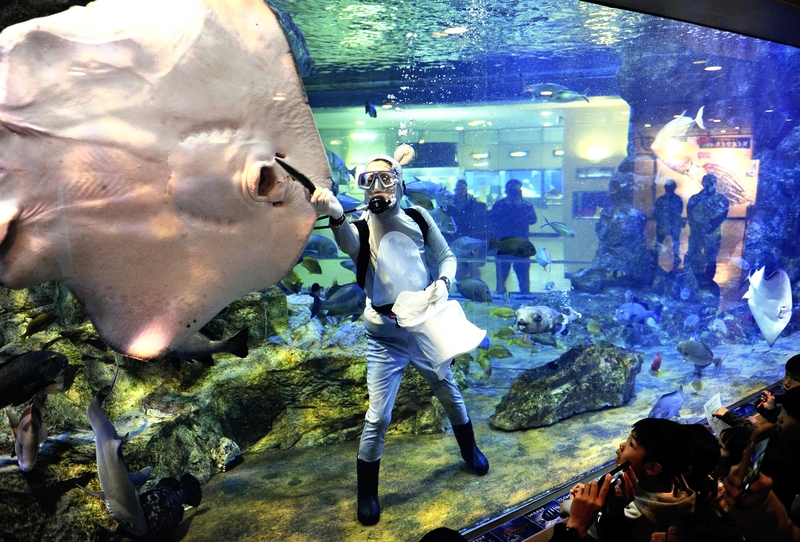 A fishkeeper dressed up as a rat feeds a ray inside a large tank at Tango Watch-kan aquarium in Miyazu, Kyoto Prefecture, on Saturday, to celebrate the start of 2020 as the Year of the Rat on the Chinese zodiac. The 300-ton tank is home to 400 fish of 70 varieties, giving the keeper plenty of species, like porcupine fish, pitted stingrays, red sea bream and others to feed for the enjoyment of visitors.