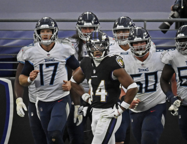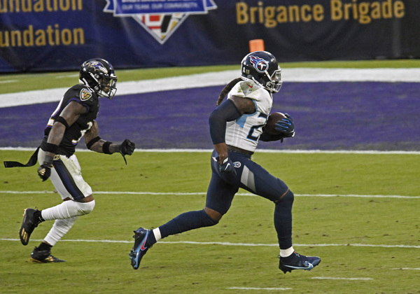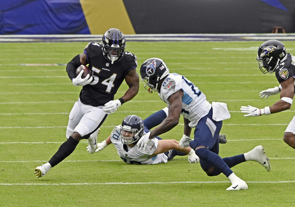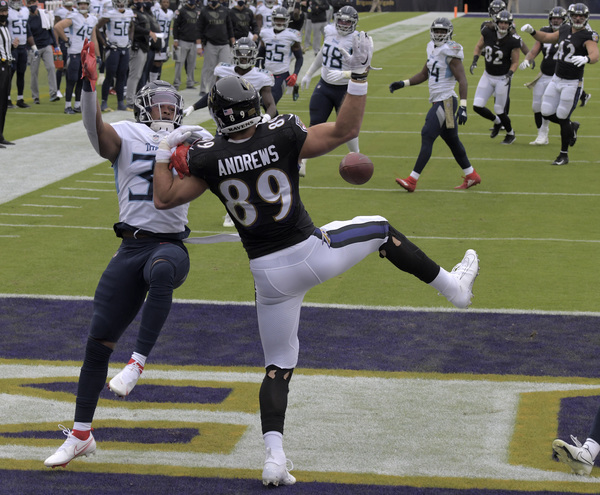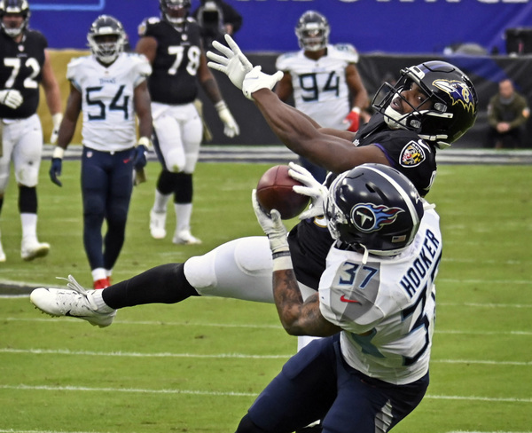 Baltimore Ravens running back Gus Edwards (35) watches running back J.K. Dobbins (27) hurdle Tennessee Titans cornerback Desmond King II for a first down during the first quarter on Sunday, Nov. 22, 2020 at M&T Bank Stadium in Baltimore, Maryland. The Titans defeated the Ravens 30-24 in overtime. (Karl Merton Ferron/Baltimore Sun/TNS)Baltimore Ravens' Tyus Bowser (54), left, runs back an interception against the Tennessee Titans' in the second quarter on Sunday, Nov. 22, 2020 at M&T Bank Stadium in Baltimore, Maryland. (Kenneth K. Lam/Baltimore Sun/TNS)Tennessee Titans' Corey Davis, right, catches an 11-yard pass in front of Baltimore Ravens' Marcus Peters during the Titans' game-winning drive in overtime on Sunday, Nov. 22, 2020 at M&T Bank Stadium in Baltimore, Maryland. The Titans defeated the Ravens 30-24. (Kenneth K. Lam/Baltimore Sun/TNS)Tennessee Titans safety Kevin Byard breaks up a pass intended for Baltimore Ravens tight end Mark Andrews (89) in the end zone during the first quarter on Sunday, Nov. 22, 2020 at M&T Bank Stadium in Baltimore, Maryland. (Karl Merton Ferron/Baltimore Sun/TNS)Tennessee Titans' Derrick Henry, right, runs away from Baltimore Ravens' DeShon Elliott, left, for a 29-yard, game-winning touchdown in overtime on Sunday, Nov. 22, 2020 at M&T Bank Stadium in Baltimore, Maryland. The Titans defeated the Ravens 30-24. (Kenneth K. Lam/Baltimore Sun/TNS)Tennessee Titans' Amani Hooker (37), center, intercepts a pass intended for Baltimore Ravens' Devin Duvernay, right, in the third quarter on Sunday, Nov. 22, 2020 at M&T Bank Stadium in Baltimore, Maryland. The Titans defeated the Ravens 30-24 in overtime. (Kenneth K. Lam/Baltimore Sun/TNS)