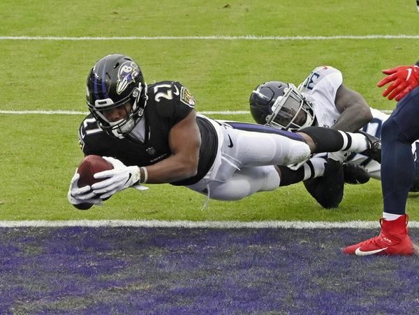 Baltimore Ravens' J.K. Dobbins (27) dives for the end zone on a two-point conversion against the Tennessee Titans' Breon Borders in the second quarter on Sunday, Nov. 22, 2020 at M&T Bank Stadium in Baltimore, Maryland. (Kenneth K. Lam/Baltimore Sun/TNS)