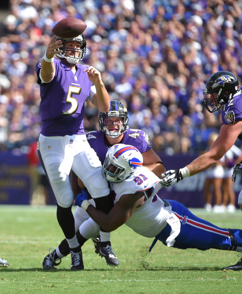 Back-to-back false start penalties on the Ravens' second offensive drive, the first called on rookie left tackle Ronnie Stanley, set them back. They still had a second-and-10 from their own 49-yard line, but a miscommunication between Flacco and veteran center Jeremy Zuttah led to a turnover. Flacco wasn't expecting the snap when Zuttah bounced it off his chest. Bills defender Preston Brown recovered it, giving the Ravens their first turnover on the season.