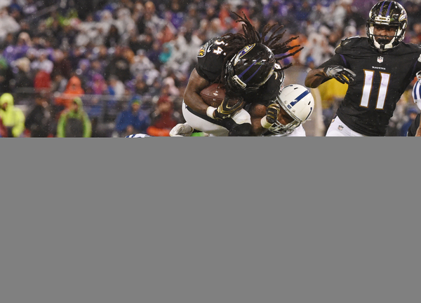 Playing on a wet and windy day in Baltimore, the Ravens got off to a solid start, forcing a three-and-out on the Colts' first possession and then moving deep into Indianapolis territory on their first offensive series. Buck Allen's second effort on a fourth-and-1 from the Colts 19 picked up the first down and a 7-yard reception by tight end Benjamin Watson set up a first-and-goal from the 7.