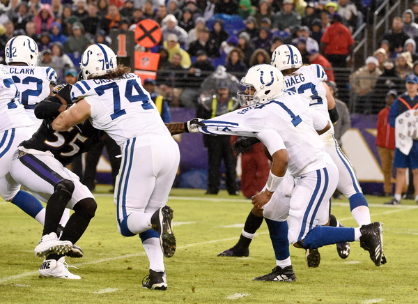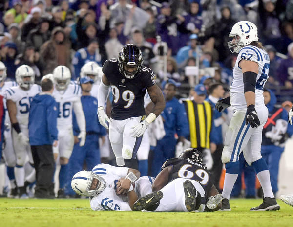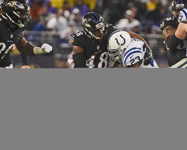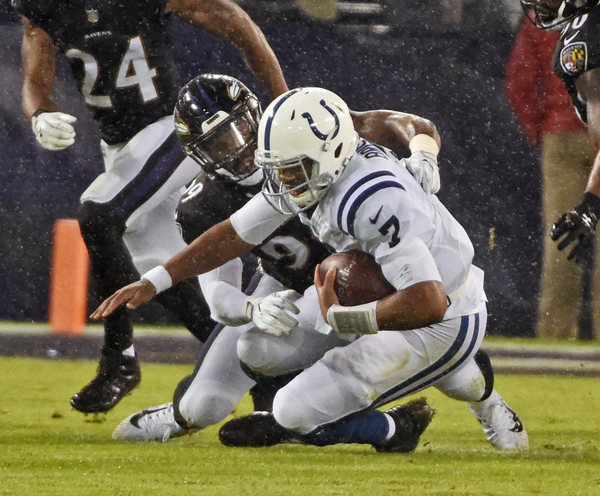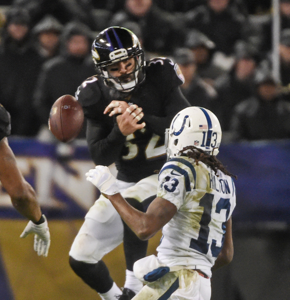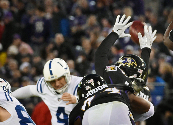 Indianapolis reached the 10-yard line at the two-minute warning. However, the Ravens stopped Frank Gore for a loss on second down and Za'Darius Smith sacked Jacoby Brissett on third down. On fourth-and-10 on the 17, Brissett targeted his best player, T.Y. Hilton, but Canady stepped in front of the pass and broke it up, setting off a celebration on the home sideline.