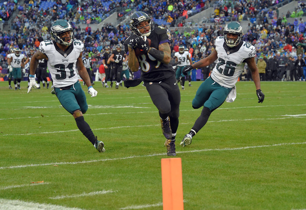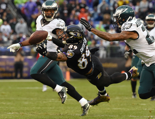 The Ravens salvaged an uneven first half when Flacco hit Steve Smith Sr. for a 34-yard touchdown to give the home team a 20-14 lead heading into intermission. Smith, who had left the game earlier in the drive with an apparent shoulder/neck injury after he dove to try and catch a Flacco pass, caught a nifty throw between cornerback Jalen Mills and safety Jaylen Watkins. Flacco pump faked on the play and then hit a tight window in between the Eagles' cornerback and safety.