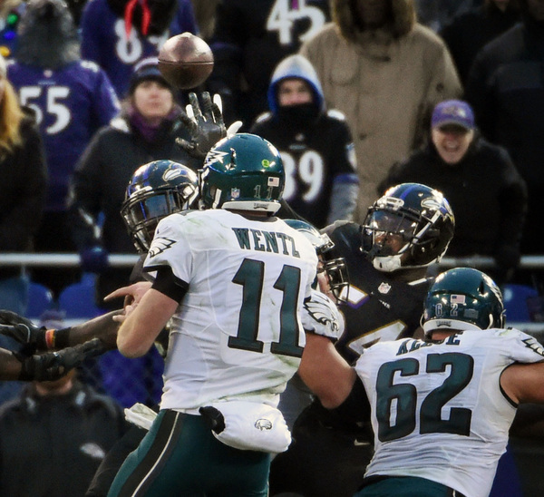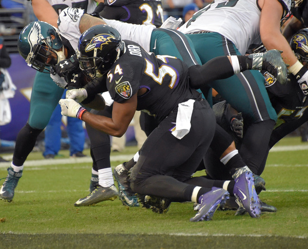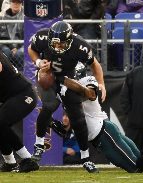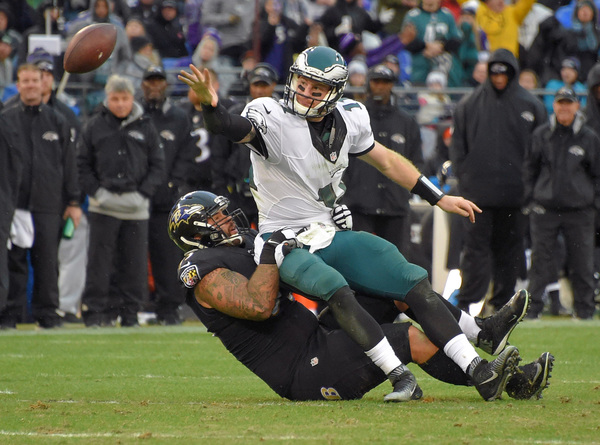 Caleb Sturgis and Justin Tucker traded field goals before Flacco set up the Eagles for a touchdown by fumbling the ball on a third-down sack by Philadelphia linebacker Nigel Bradham. Dixon whiffed on a block and Bradham jarred the ball loose.