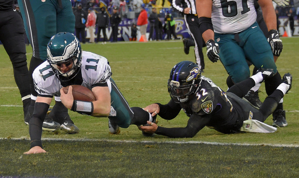 Rookie quarterback Carson Wentz, attempting to complete a 10-point fourth-quarter comeback, scored on a 4-yard touchdown scramble to cut the Ravens' lead to 27-26. His team already eliminated from playoff contention, Eagles coach Doug Pederson opted to go for the two points and the win, but Wentz's pass, intended for Jordan Matthews, was tipped at the line of scrimmage and fell incomplete.