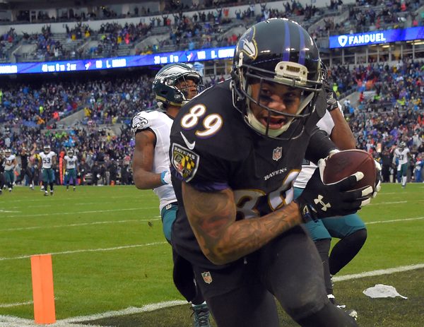 Kenneth Dixon scored on a 16-yard touchdown run and Flacco threw two touchdown passes, but also was intercepted once and fumbled on another possession, both turnovers leading to Eagles' points.