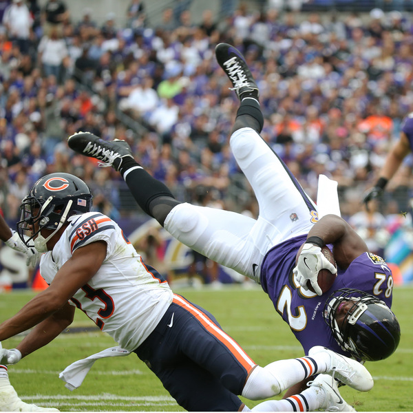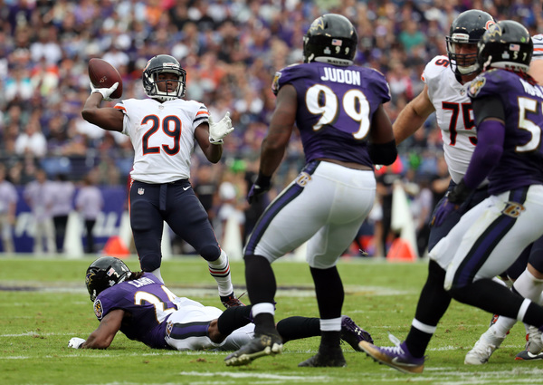 Flacco threw another interception in the first half that bounced out of the hands of Breshad Perriman and was caught by Bryce Callahan, who returned it 52 yards to set up rookie running back Tarik Cohen's halfback option 21-yard touchdown pass to Zach Miller. A fumble by Ravens tight end Maxx Williams deep in Bears territory also cost the Ravens.