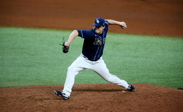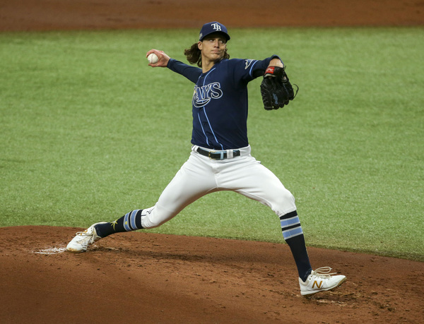 Tampa Bay Rays starting pitcher Tyler Glasnow (20) delivers a pitch in the first inning against the Toronto Blue Jays Wednesday, September 30, 2020 in St. Petersburg, Florida. (Chris Urso/Tampa Bay Times/TNS)