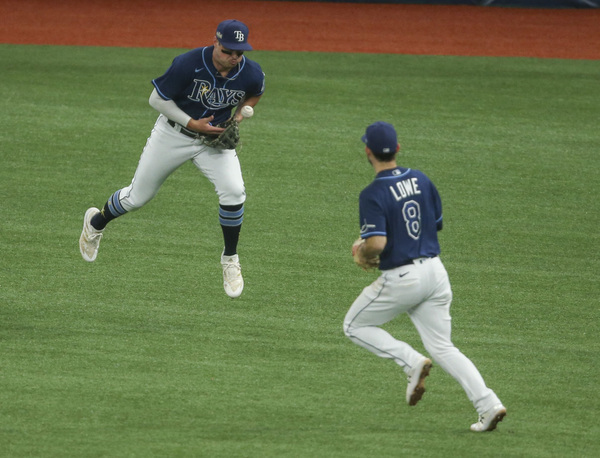 Tampa Bay Rays right fielder Hunter Renfroe (11) can't handle a short fly ball hit by Toronto Blue Jays right fielder Teoscar Hernandez (37) during the second inning as Tampa Bay Rays second baseman Brandon Lowe (8) looks on Wednesday, September 30, 2020 in St. Petersburg, Florida. (Chris Urso/Tampa Bay Times/TNS)
