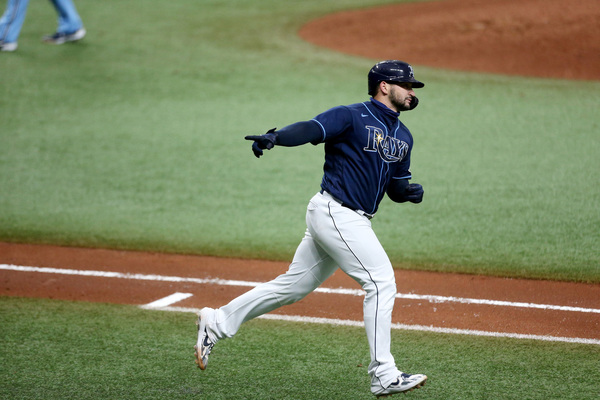 Tampa Bay Rays catcher Mike Zunino (10) runs the bases on a home run during the second inning of Game 2 on Wednesday, September 30, 2020, of the American League East matchup in a best-of-three wild card series at Tropicana Field in St. Petersburg, Florida. (Douglas R. Clifford/Tampa Bay Times/TNS)