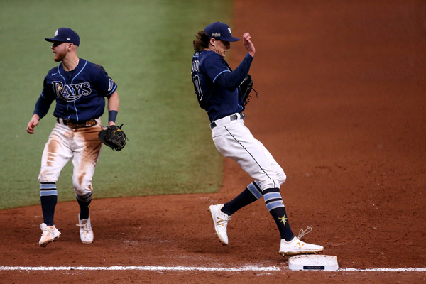 Tampa Bay Rays starting pitcher Tyler Glasnow (20) tags first after avoiding a collision with Tampa Bay Rays second baseman Michael Brosseau (43) while en route to tag out Toronto Blue Jays second baseman Joe Panik (2) during the fourth inning of game two on Wednesday, September 30, 2020, of the American League East matchup in a best-of-three wild card series at Tropicana Field in St. Petersburg, Florida. (Douglas R. Clifford/Tampa Bay Times/TNS)