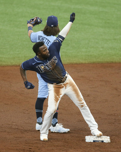 Tampa Bay Rays left fielder Randy Arozarena (56) celebrates after hitting a double in the second inning as Toronto Blue Jays shortstop Bo Bichette (11) awaits the late throw Wednesday, September 30, 2020 in St. Petersburg, Florida. (Chris Urso/Tampa Bay Times/TNS)