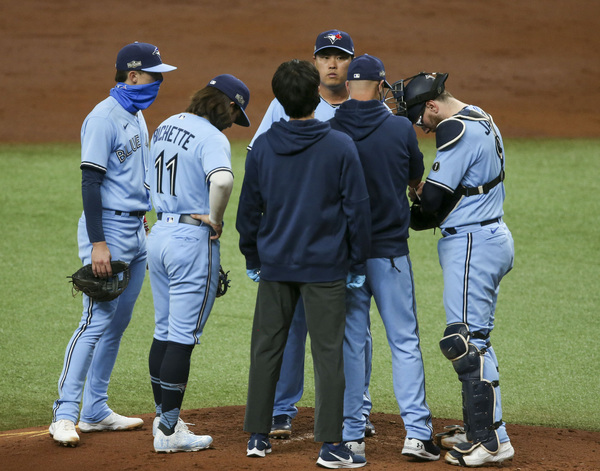 Toronto Blue Jays starting pitcher Hyun-Jin Ryu (99), facing, is seen during a visit to the mound in the second inning against the Tampa Bay Rays Wednesday, September 30, 2020 in St. Petersburg, Florida. (Chris Urso/Tampa Bay Times/TNS)