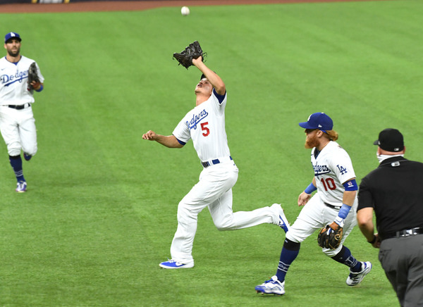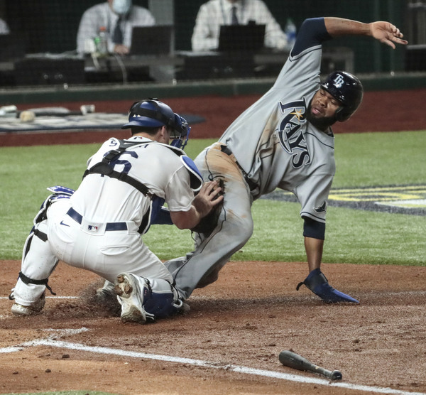 Tampa Bay Rays right fielder Manuel Margot, middle, and center fielder Kevin Kiemaier can't make the catch on a double by the Los Angeles Dodgers' Justin Tuner in the eighth inning in Game 2 of the World Series at Globe Life Field in Arlington, Texas, on Wednesday, Oct. 21, 2020. The Rays won, 6-4, to even the series. (Wally Skalij/Los Angeles Times/TNS)
