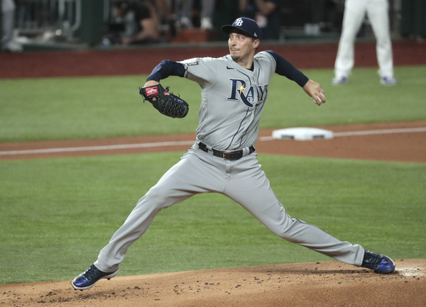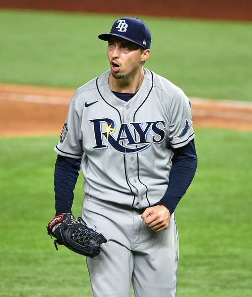 Tampa Bay Rays pitcher Blake Snell reacts after striking out the Los Angeles Dodgers' Will Smith in the fourth inning in Game 2 of the World Series at Globe Life Field in Arlington, Texas, on Wednesday, Oct. 21, 2020. (Wally Skalij/Los Angeles Times/TNS)